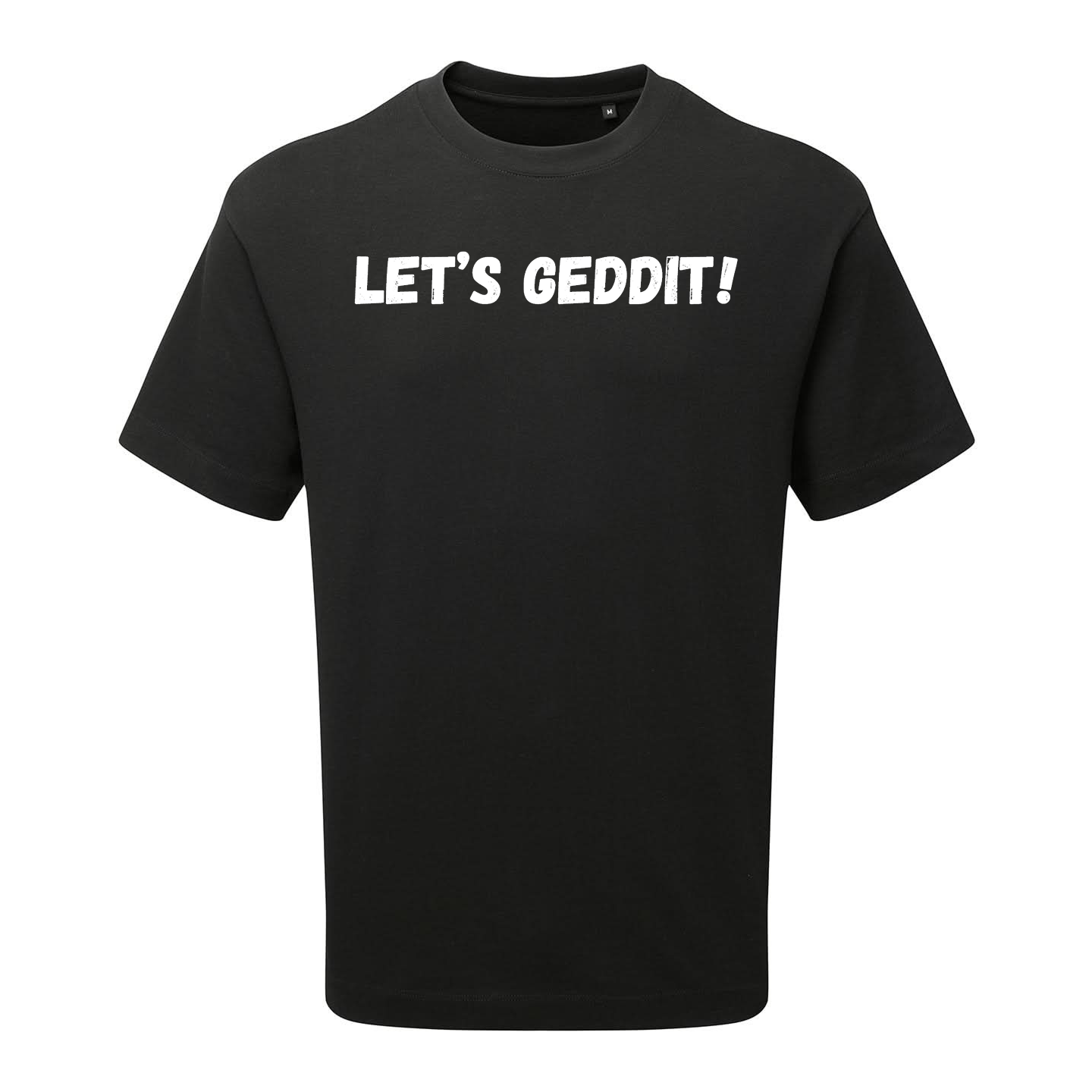 IBH Heavyweight T-Shirt with white print, your choice of slogan from Ice Bath Harry with either "LET'S GEDDIT!" or "GO GEDDIT!". These T-Shirts are 220gsm and are made from certified Organic Ringspun Cotton, with an oversized cut.